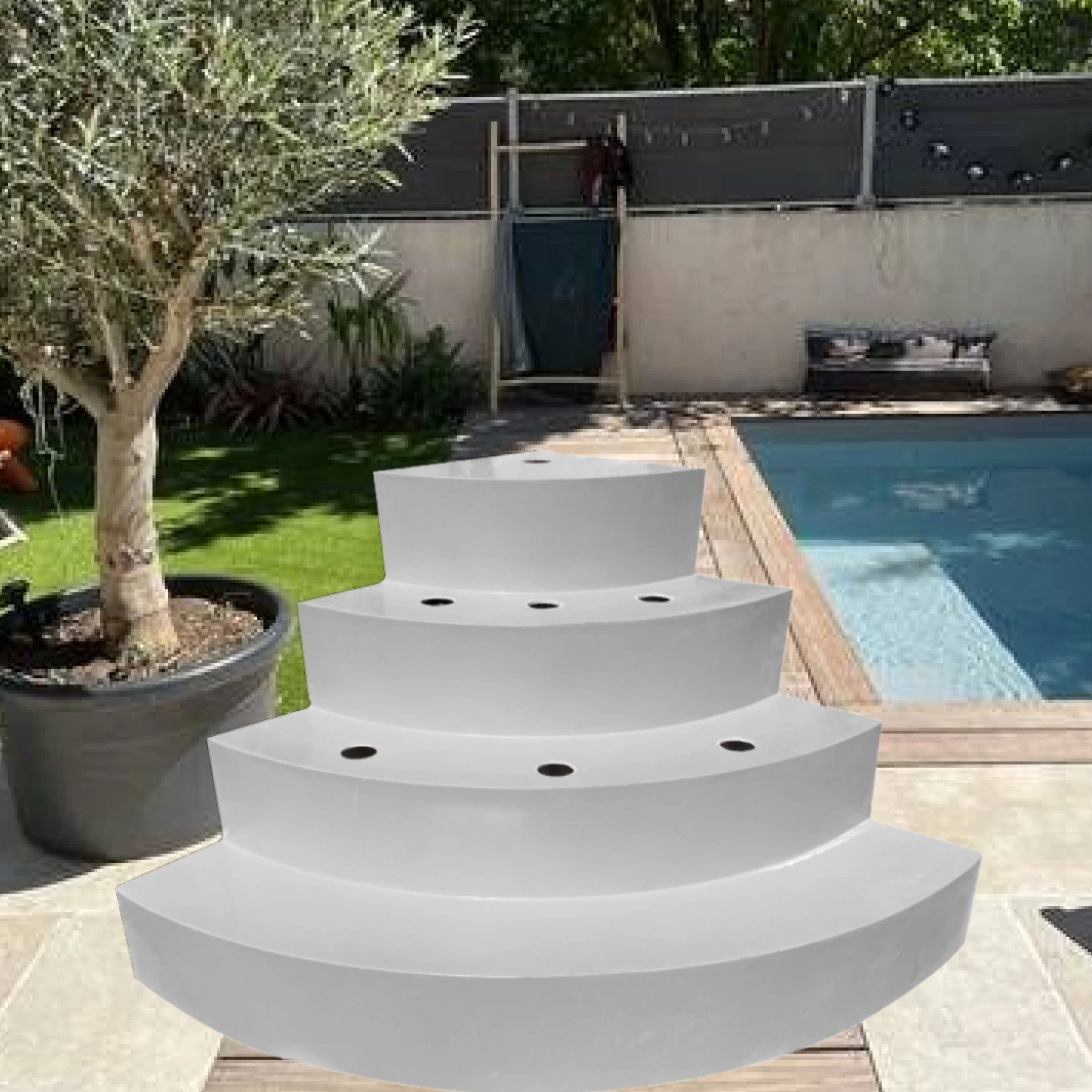 Vous pouvez choisir parmi de nombreuses couleurs comme le gris, le blanc, le sable ou encore l’anthracite, tout en optant pour des escaliers intégrés ou au design plus contemporain. L’éclairage LED, pilotable à distance, apporte une ambiance unique à votre bassin, tandis que le liner haut de gamme se décline en de multiples coloris pour un rendu esthétique parfaitement maîtrisé.